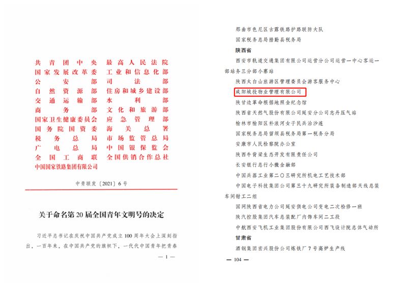 【咸陽(yáng)城投物業(yè)管理有限公司榮獲“第20屆全國(guó)青年文明號(hào)”稱號(hào)!】